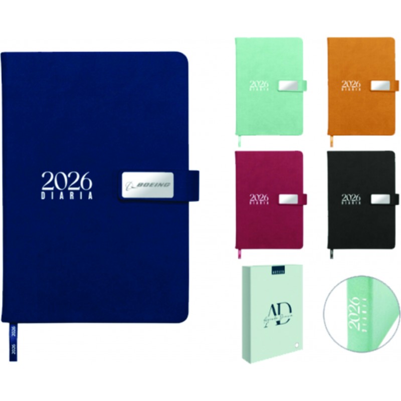 AGENDA DIARIA CON BROCHE PASTA RIGIDA CONCINTILLOMETALICO , SUJETADOR PARA BOLIGRAFO Y SEPARADOR INCLUYE CAJA