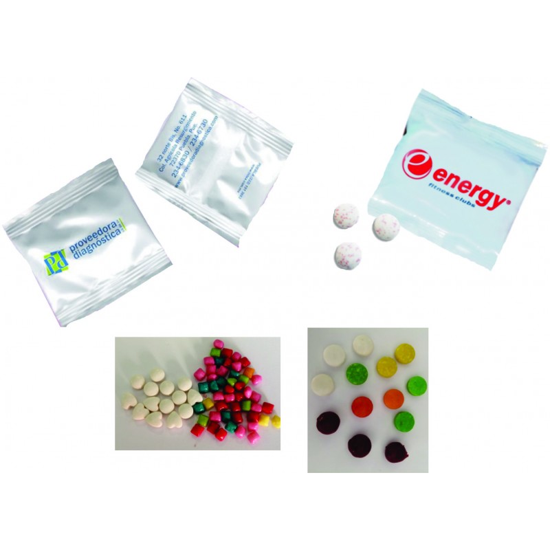 DULCE PUBLICITARIO TAMAÑO 4 x 5 cm IMPRESOS EN FLEXOGRAFIA MAXIMO 4 TINTAS ( NO SELECCION DE COLOR) MINIMO DE COMPRA 3 BOLSAS CON 1.5 kg. APROXIMADAMENTE, AREA DE IMPRESION 3.5 X 3 cm AL FRENTE Y 3 X 1 cm AL REVERSO, SABORES DE DULCES, MENTAS, CHAMOY Y VARIADO EN MACIZO.
